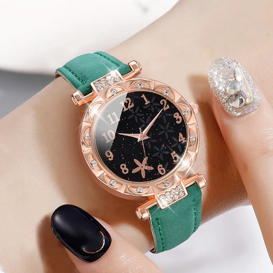 Ladies Green Watch 6PCS/Set Starfish Element Starry Sky Dial Quartz Wristwatch Frosted Strap Watch Jewelry Set Gift For Mom