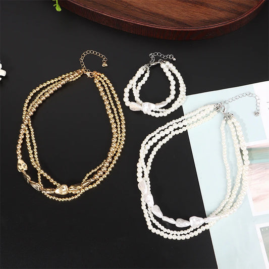 Layered Pearl Necklace & Bracelet Set: Elegant Heart Accents for Women