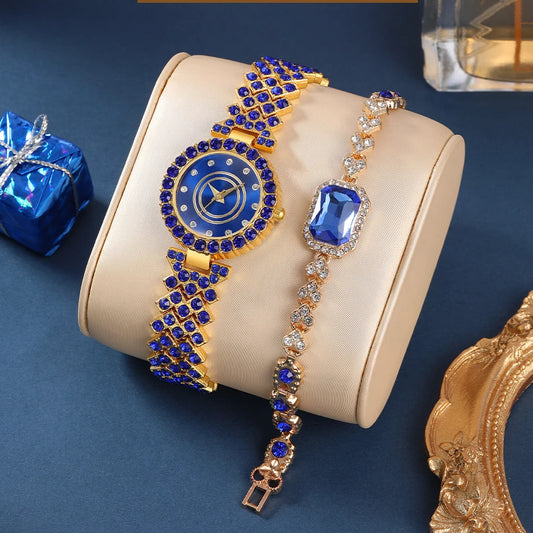 Midnight Blue Crystal Watch & Bracelet Set – Elegance in Sapphire & Gold