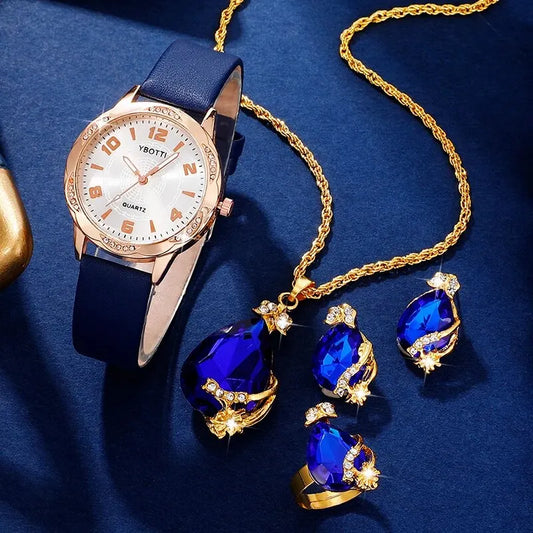 Midnight Sapphire Collection: Blue Leather Watch & Crystal Jewelry Set